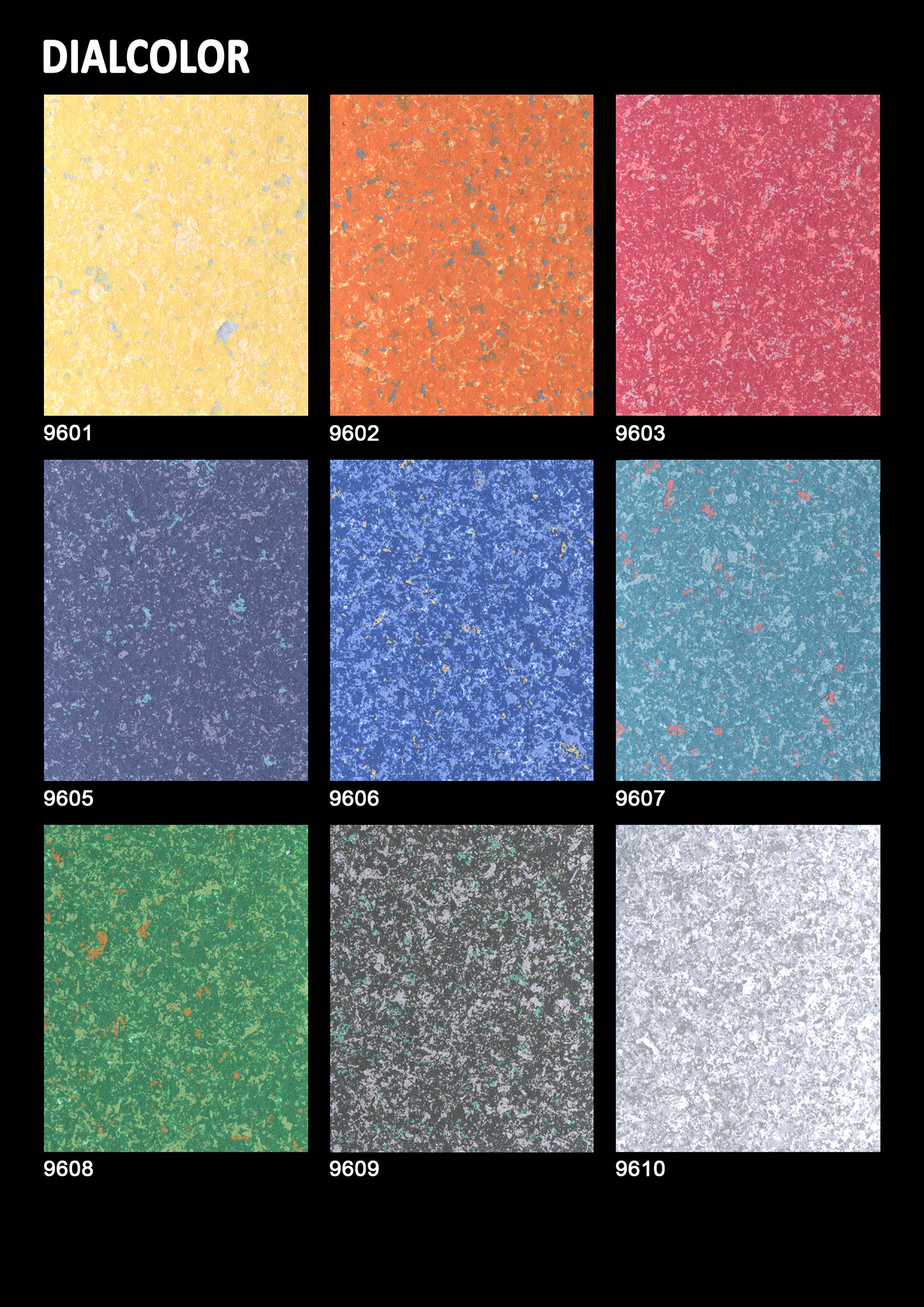 Nowoczesna farba wielokolorowa, zwana potocznie tapetą natryskową. Dzięki niepowtarzalnemu wyglądowi i niespotykanej odporności na szorowanie na mokro DIALCOLOR znajduje bardzo szerokie zastosowanie w wykańczaniu różnego rodzaju wnętrz. Doskonale sprawdza się zarówno w prywatnych domach i mieszkaniach, poprzez powierzchnie biurowe i przyprodukcyjne, aż po budynki użyteczności publicznej, szkoły, przedszkola, hotele oraz powierzchnie wykorzystywane dla celów szeroko rozumianej służby zdrowia.